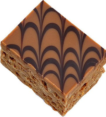 Crunchy nibs in a rough hazelnut praline on a layer of marzipan